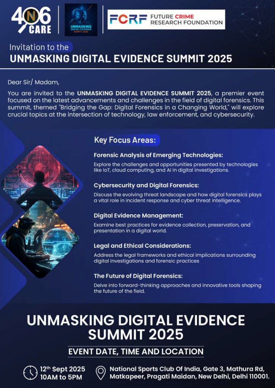 The Unmasking Digital Evidence Summit 2025, organized by the 4N6 Care in Collaboration with Future Crime Research Foundation (FCRF), positions itself at the crossroads of two urgent concerns: the technological sophistication of modern crime and the legal system’s ability to respond effectively. Themed “Bridging the Gap: Digital Forensics in a Changing World,” the summit underscores how data, from cloud storage to artificial intelligence systems, is increasingly central to criminal investigations.