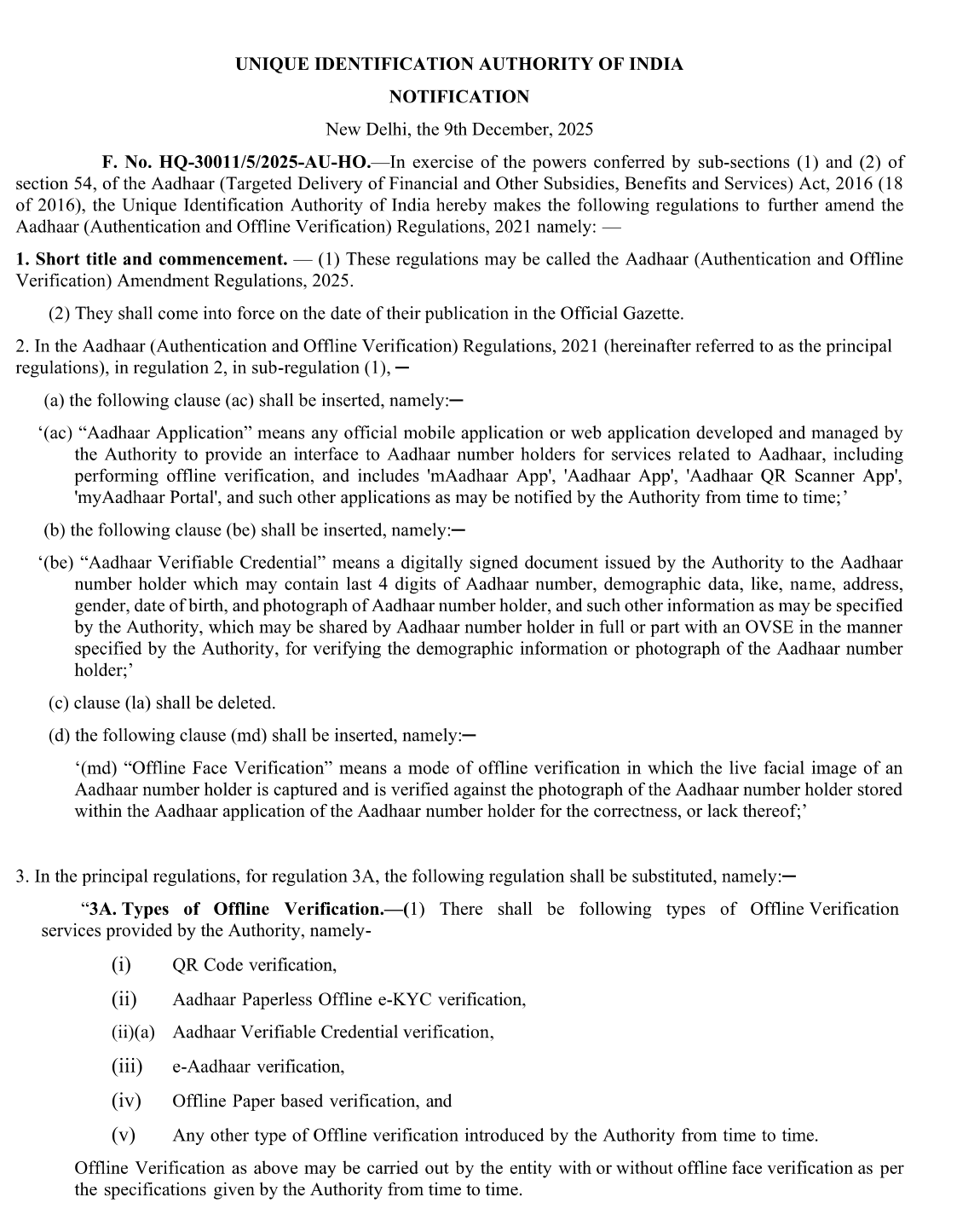 The regulations also introduce “Offline Face Verification”, allowing a captured face image to be matched locally with the Aadhaar holder’s photograph embedded in the credential — without transmitting biometrics over networks.