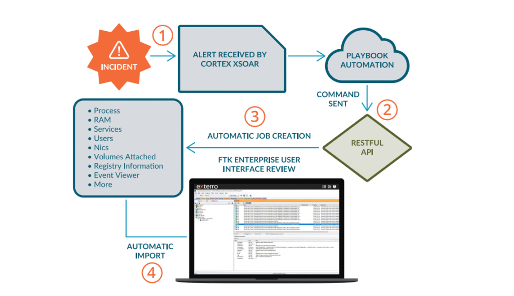 With the integration between the Palo Alto Networks Cortex XSOAR platform and the Exterro FTK Connect automation platform, users can now leverage Cortex XSOARs security orchestration and automation capabilities to trigger the immediate capture and preservation of endpoint evidence by FTK Enterprise, FTK Central, or FTK Lab, crucial for incident investigation and recovery.