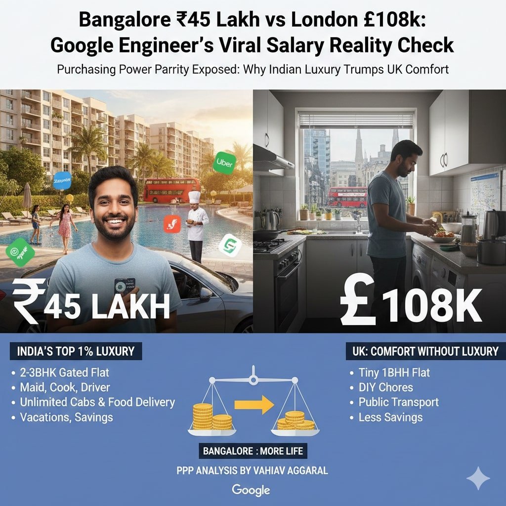 Social media glorifies crore-plus foreign packages, but Google engineer Vaibhav Agarwal’s LinkedIn post proves ₹45 lakh in Bangalore often delivers better real life than London’s £108,000 paycheck. His purchasing power parity (PPP) analysis has gone viral, challenging the “abroad = rich” myth that misleads young professionals.