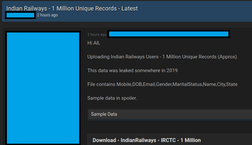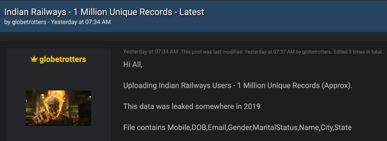 “As part of my regular deep web and dark web monitoring, I came across a threat actor who claimed to have around one million customer records of IRCTC. The data seems to be legitimate,” Praveen who is associated with Noida based Root64 Infosec Research Foundation told The420.