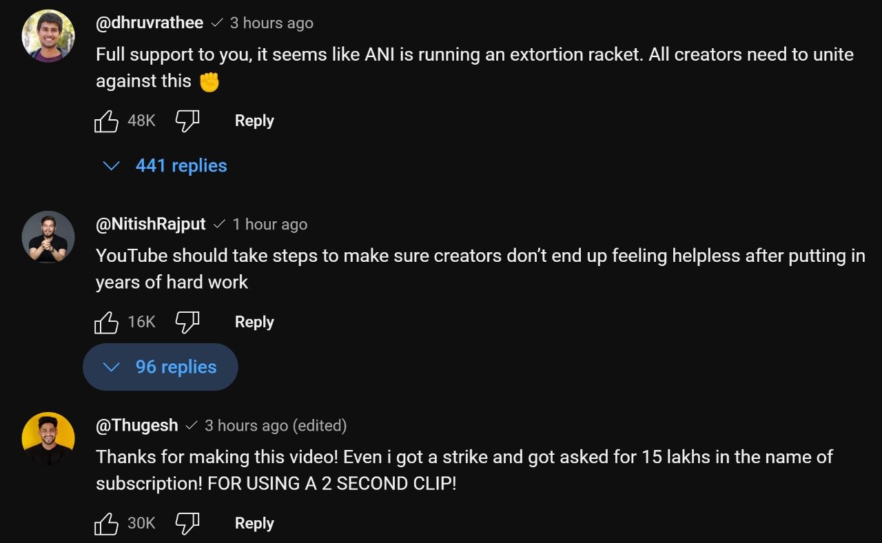 Another major voice, Dhruv Rathee, weighed in with even stronger language: “Full support to you. It seems like ANI is running an extortion racket. All creators need to unite against this.”