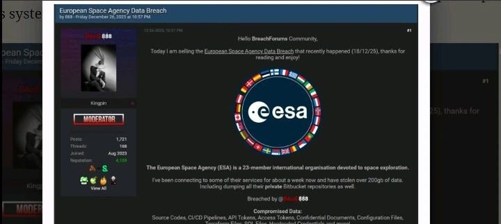 Their version, however, paints a far more damaging picture. On the cybercrime marketplace BreachForums, an alleged attacker claimed they accessed ESA-linked systems on December 18 and maintained a foothold for about a week. During that time, they say they exfiltrated: