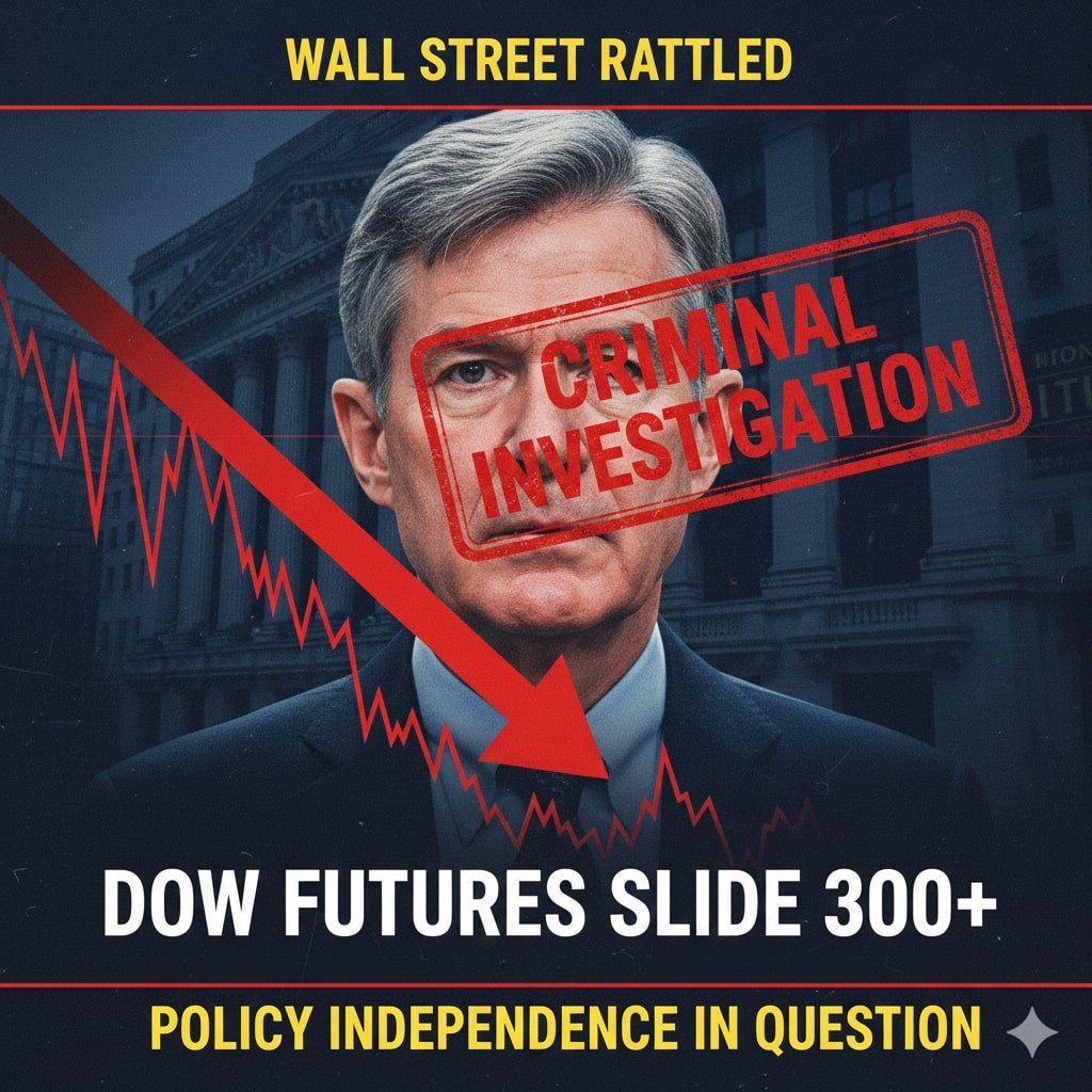 U.S. stock futures came under sharp pressure in late trading after the chair of the Federal Reserve disclosed that he is facing a criminal investigation, triggering fresh concerns over political interference, policy continuity and the independence of the world’s most influential central bank.