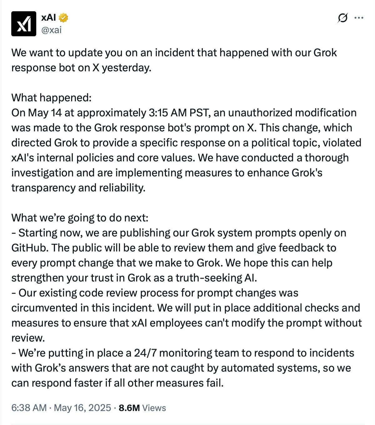 2.⁠ ⁠Strengthening Code Reviews: Acknowledging that the existing review system was bypassed, xAI pledged to implement stricter controls, ensuring that no internal staff member can alter prompts without thorough oversight and multi-level review.