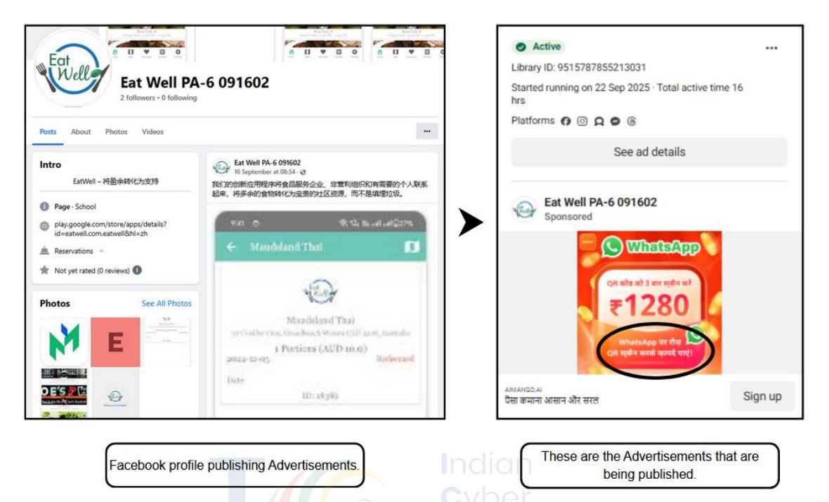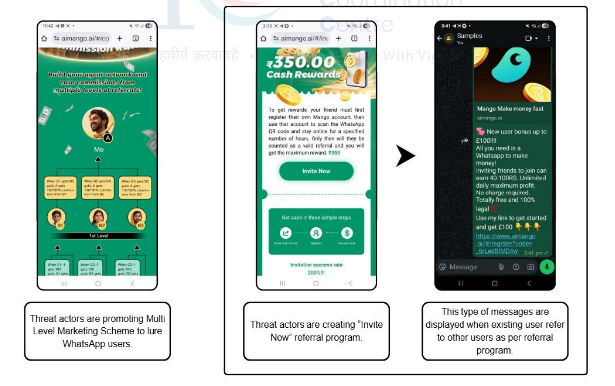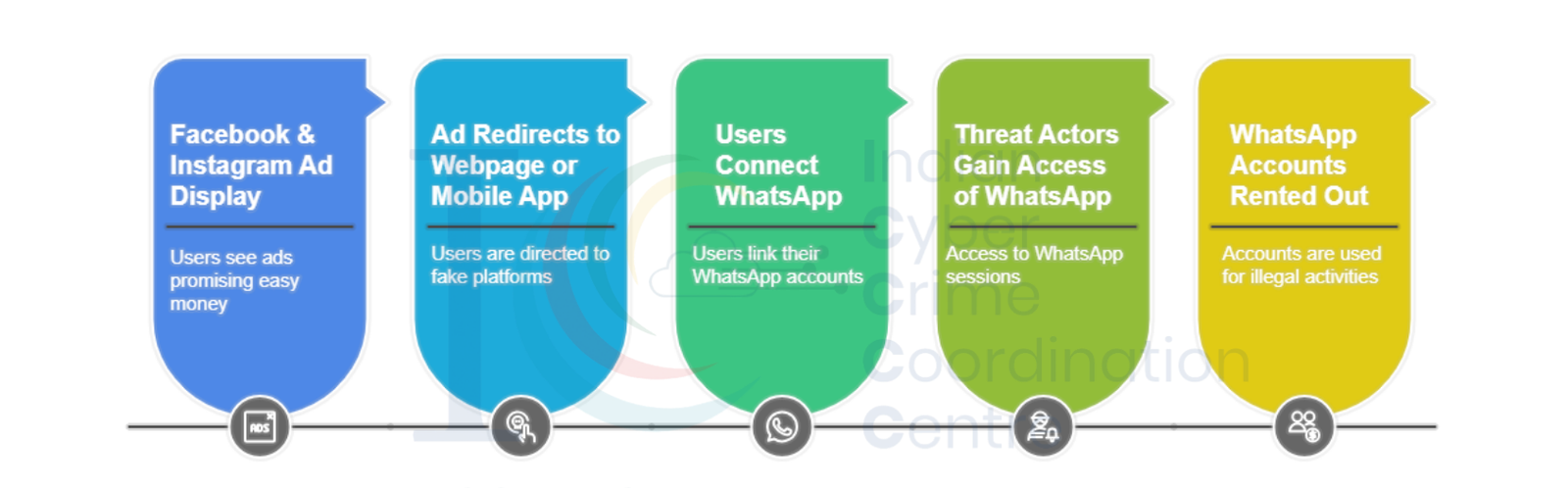 The National Cybercrime Threat Analytics Unit of I4C has identified an emerging transnational crime trend where certain Facebook & Instagram accounts are publishing advertisements that claim users can “earn cash automatically” by linking their WhatsApp accounts with their platform. These advertisements redirect users to fraud web pages or Android mobile applications (.apk) that imitate legitimate earning platforms.