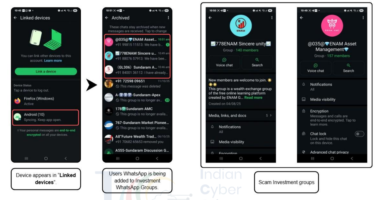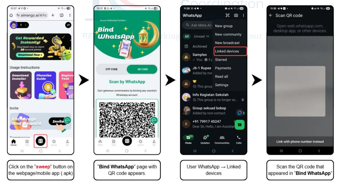 - Account Linking: Victims are instructed to scan a QR code displayed in-app via WhatsApp. Once scanned, the scammer system gains linked-device access to the victim’s WhatsApp account.
