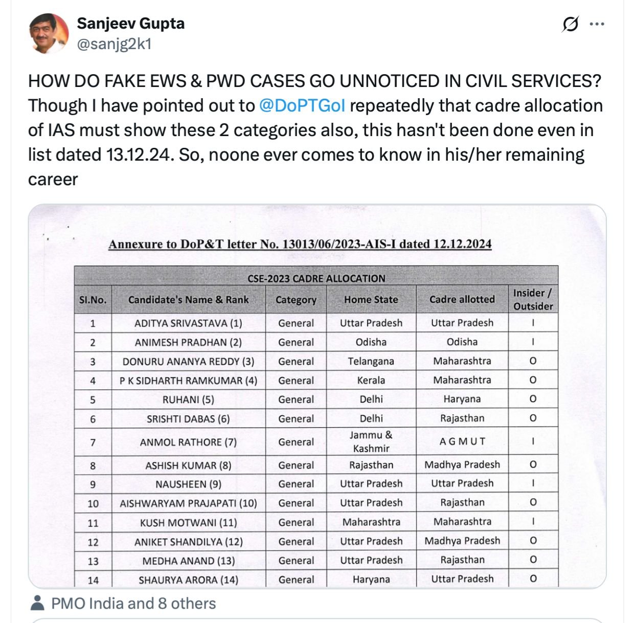 Former IAS officer Sanjeev Gupta slammed the structural flaws in the recruitment system. “How do fake EWS and PwBD cases go unnoticed in civil services?” he questioned, pointing out that the Civil Services Exam (CSE) Rules mandate medical verification for benchmark disabilities only through AIIMS Delhi — a clause reportedly bypassed in some cases.