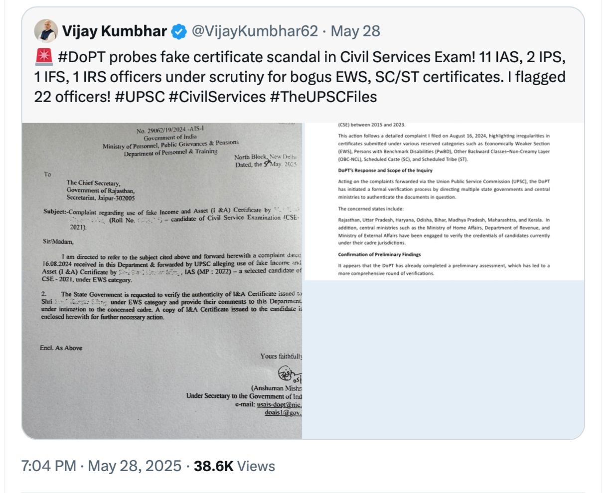 A May 5 letter from DoPT, signed by Anshuman Mishra, has directed the Rajasthan and Madhya Pradesh governments to verify the authenticity of the EWS certificate used by the accused IAS officer. Simultaneously, other state governments and departments have been asked to conduct similar verification for officers named in the complaint.