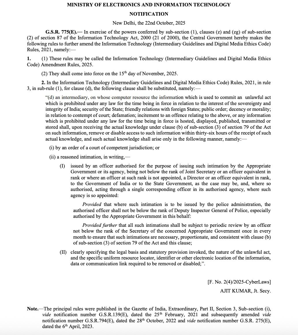 The Government of India has tightened regulations on online content moderation under Section 79(3)(b) of the Information Technology Act, limiting the authority to send take down notices to senior officials. The Ministry of Electronics and Information Technology (MeitY) announced on October 22, 2025, that effective November 15, 2025, only officers at the rank of Joint Secretary or above, or in law enforcement, Deputy Inspector General of Police (DIG) or above, will have the power to issue such notices to social media platforms.