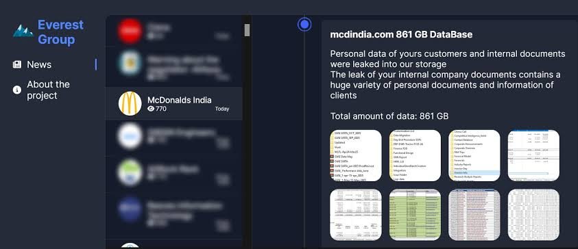 On January 20, 2026, a post appeared on a dark web leak site operated by the Everest ransomware group. The message was blunt. The attackers said they had exfiltrated 861 gigabytes of data from McDonald’s India, describing a trove that included internal company records and what they called a “huge variety of personal documents and information of clients.”