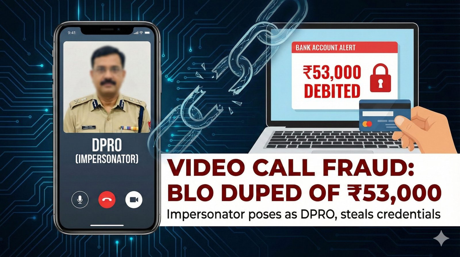A fraudster impersonating the District Programme Officer (DPRO) of Meerut tricked a Block Level Officer (BLO) via video call into sharing his login credentials, siphoning ₹53,000 from his bank account within minutes.
