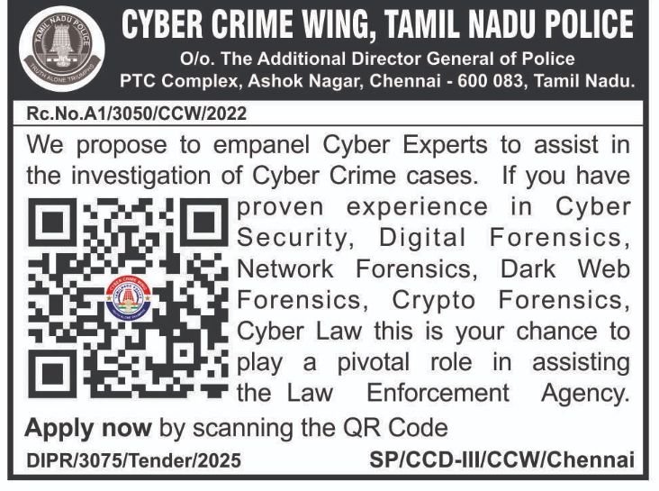 A formal notice, listed under Rc.No. A1/3050/CCW/2022 and circulated widely, states that Tamil Nadu Police is looking to empanel professionals with experience in Cybersecurity, Digital Forensics, Network Forensics, Dark Web Forensics, Crypto Forensics, and Cyber Law. These experts will work alongside official investigation teams, providing critical support in decoding, tracking, and prosecuting digital crimes.