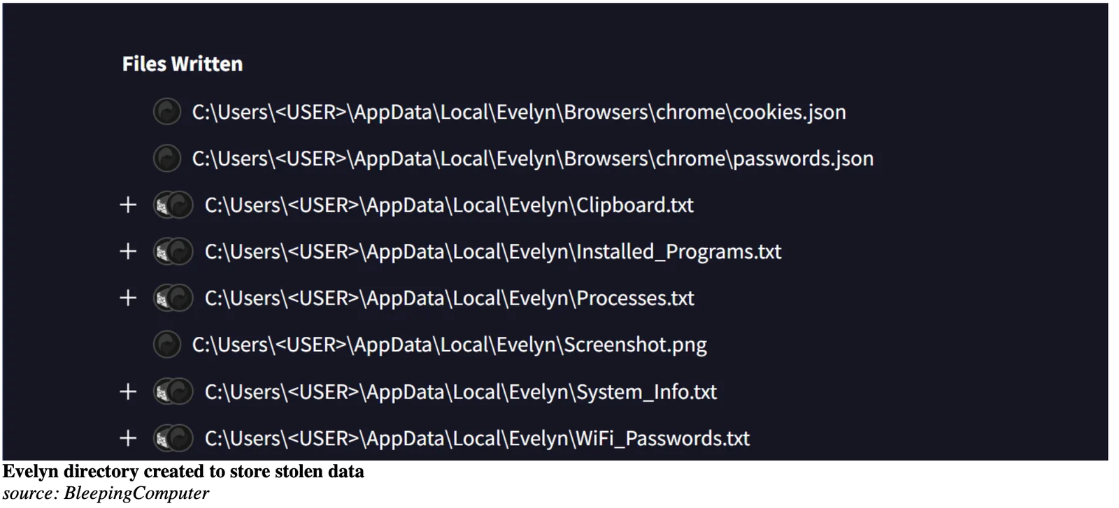The DLL, detected as malicious by 29 of 72 antivirus engines on VirusTotal, deployed an info-stealer under the process name runtime.exe. Once active, the malware created a hidden directory named Evelyn inside %APPDATA%\Local\, quietly populating it with stolen data.