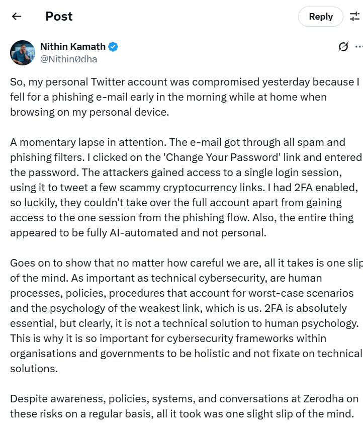 Kamath candidly acknowledged that despite Zerodha’s internal cybersecurity practices, including regular awareness campaigns, he still fell for a well-crafted phishing message.